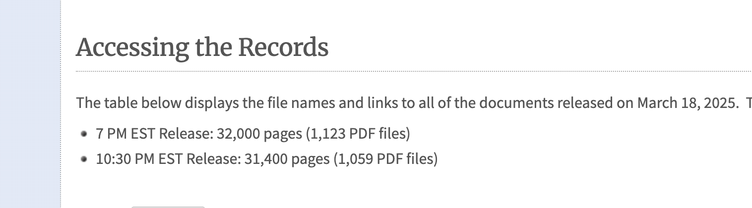 According to the National Archives’ website, at 7 p.m. EST Tuesday, 1,123 PDF documents (totaling 32,000 pages) were released. Then at 10:30 p.m., an additional 1,059 documents (totaling 31,400 pages) dropped.